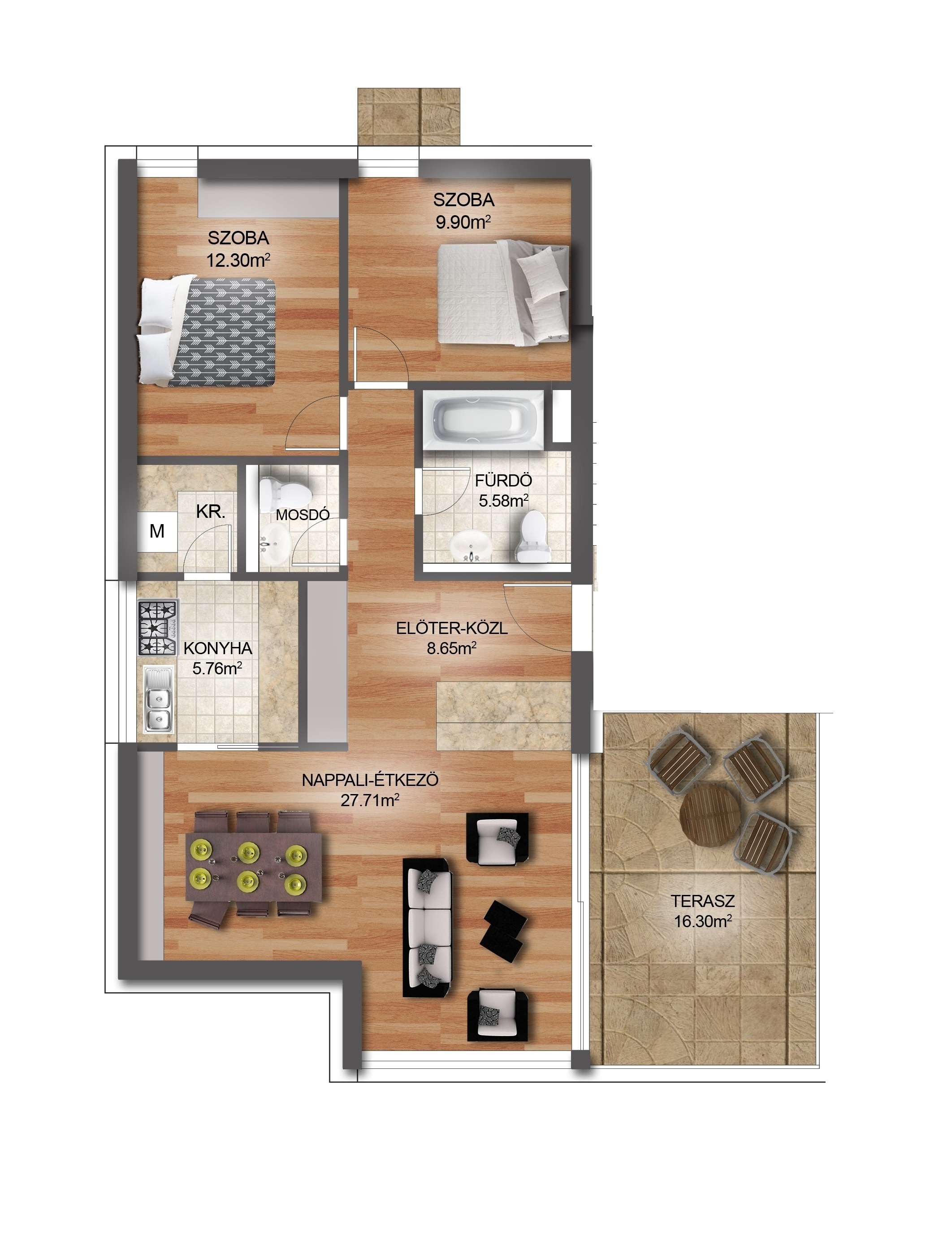 Előtér (4,89 m²), mosdó (1,91 m²), fürdő (5,49 m²), közlekedő (2,50 m²), szoba (9,68 m²), szoba (9,32 m²), nappali-étkező (30,42 m²), konyha (6,52 m²), háztartási helyiség (2,20 m²), gardrób (4,04 m²), fürdő (4,13 m²), szoba (11,34 m²), terasz (21,00 m²), terasz (12,66 m²). Ehhez a lakáshoz kizárólagos használatú kert is tartozik.