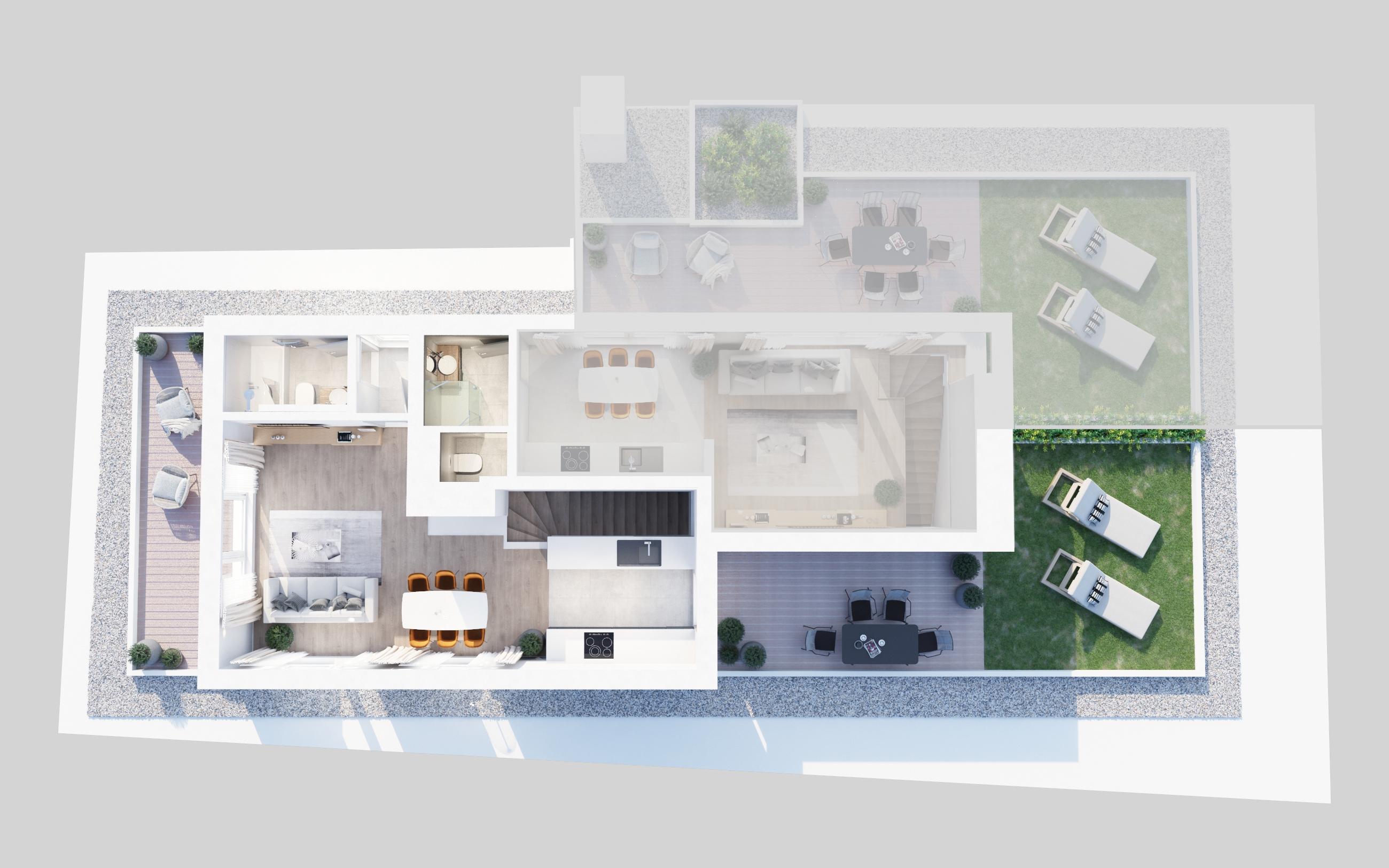 A 80 négyzetméteres lakás műszaki megoldásai kiemelkedőek: hőszigetelt alumínium nyílászárók három rétegű üveggel, energiatakarékos levegő-víz hőszivattyús fűtés és hűtés, valamint mennyezethűtési és padlófűtési rendszerek gondoskodnak az optimális komfortérzetről. A lakás alsó szintjén találhatóak a hálószobák és egy fürdőszoba, a felső szinten az amerikai konyhás nappali, egy második fürdőszobával. Ezen a szinten a lakás két oldalán két külön nagy teraszra léphetünk ki, de az alsó szint is kapott egy kis teraszt.