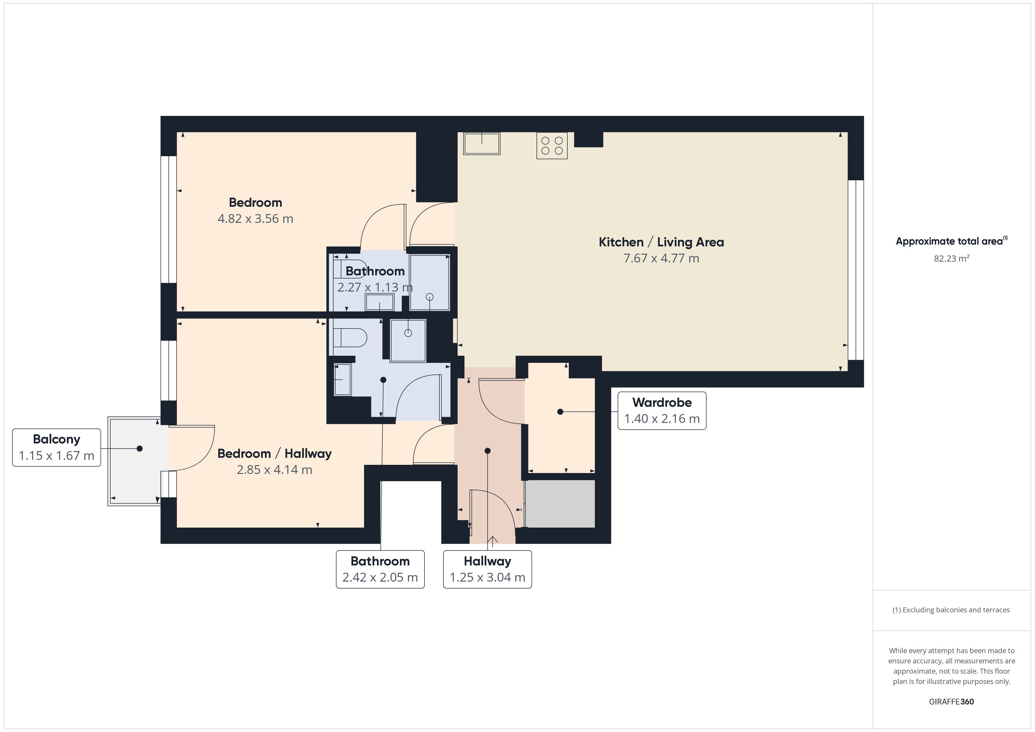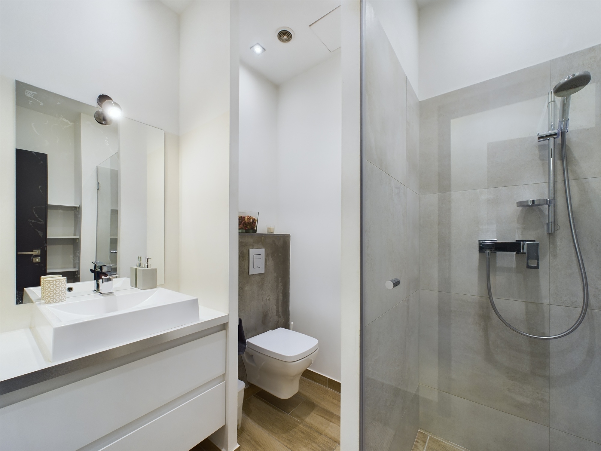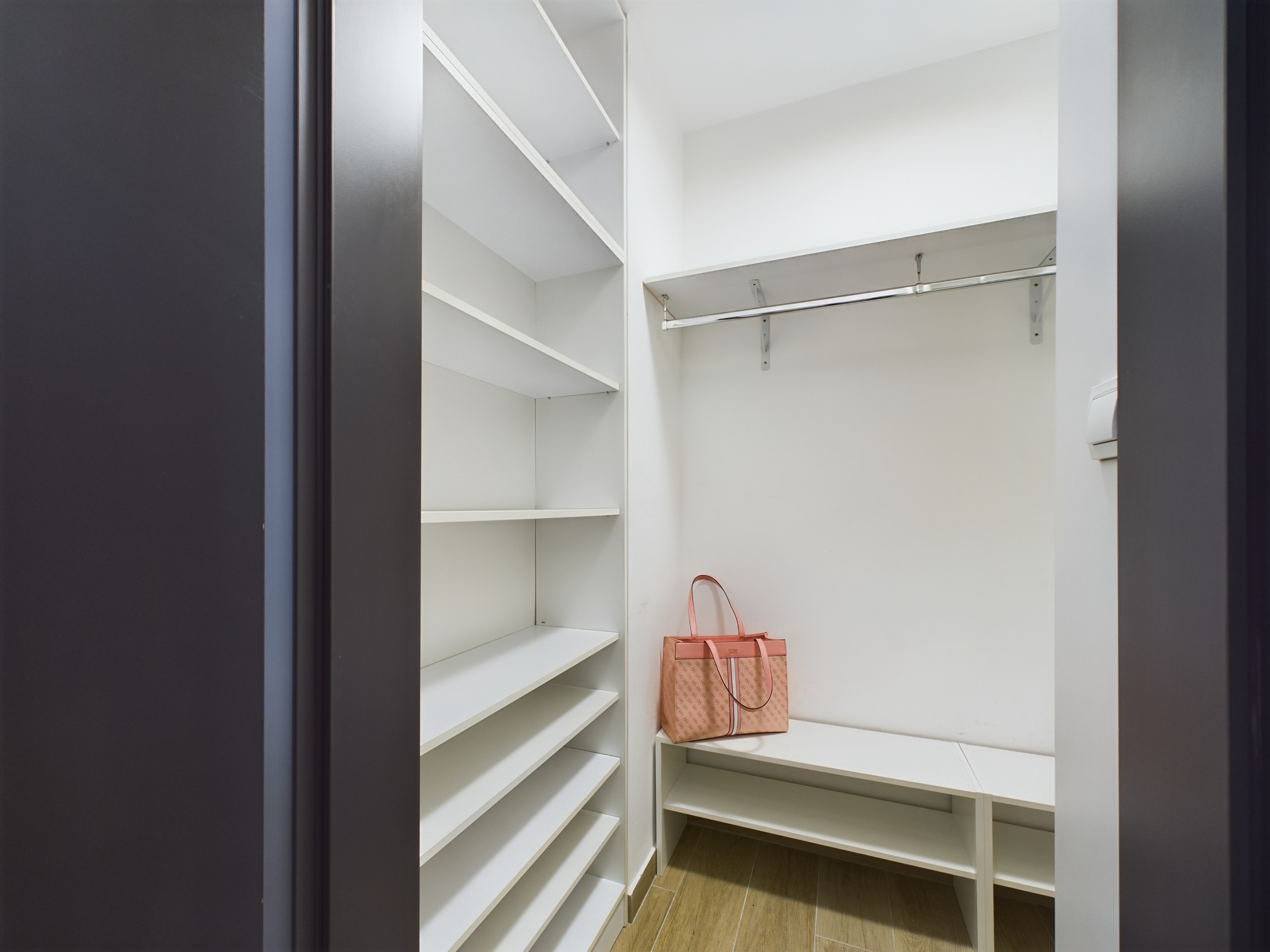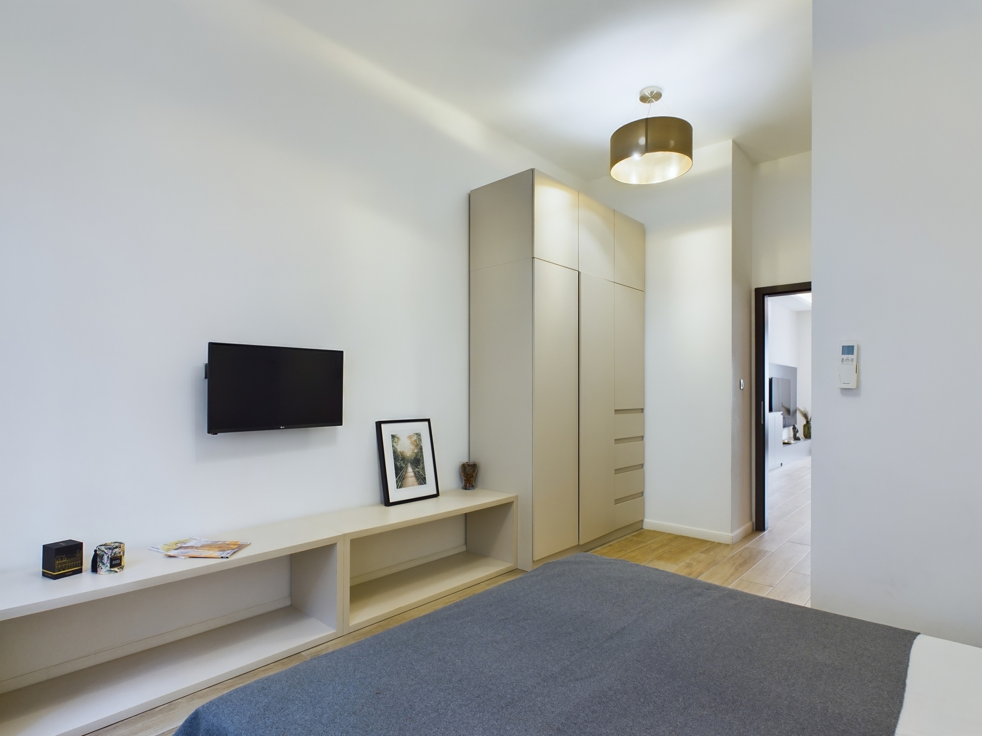 Az előtérből balra található az egyik hálószoba, zuhanyzós fürdővel, udvarra nyíló erkéllyel. Továbbá helyet kapott az előtérben egy gardróbszoba is. Innen a tágas amerikai konyhás nappaliba jutunk, melynek ablakai a Sas utcára néznek. A konyha mellett található a másik hálószoba, szintén egy zuhanyzós fürdővel.