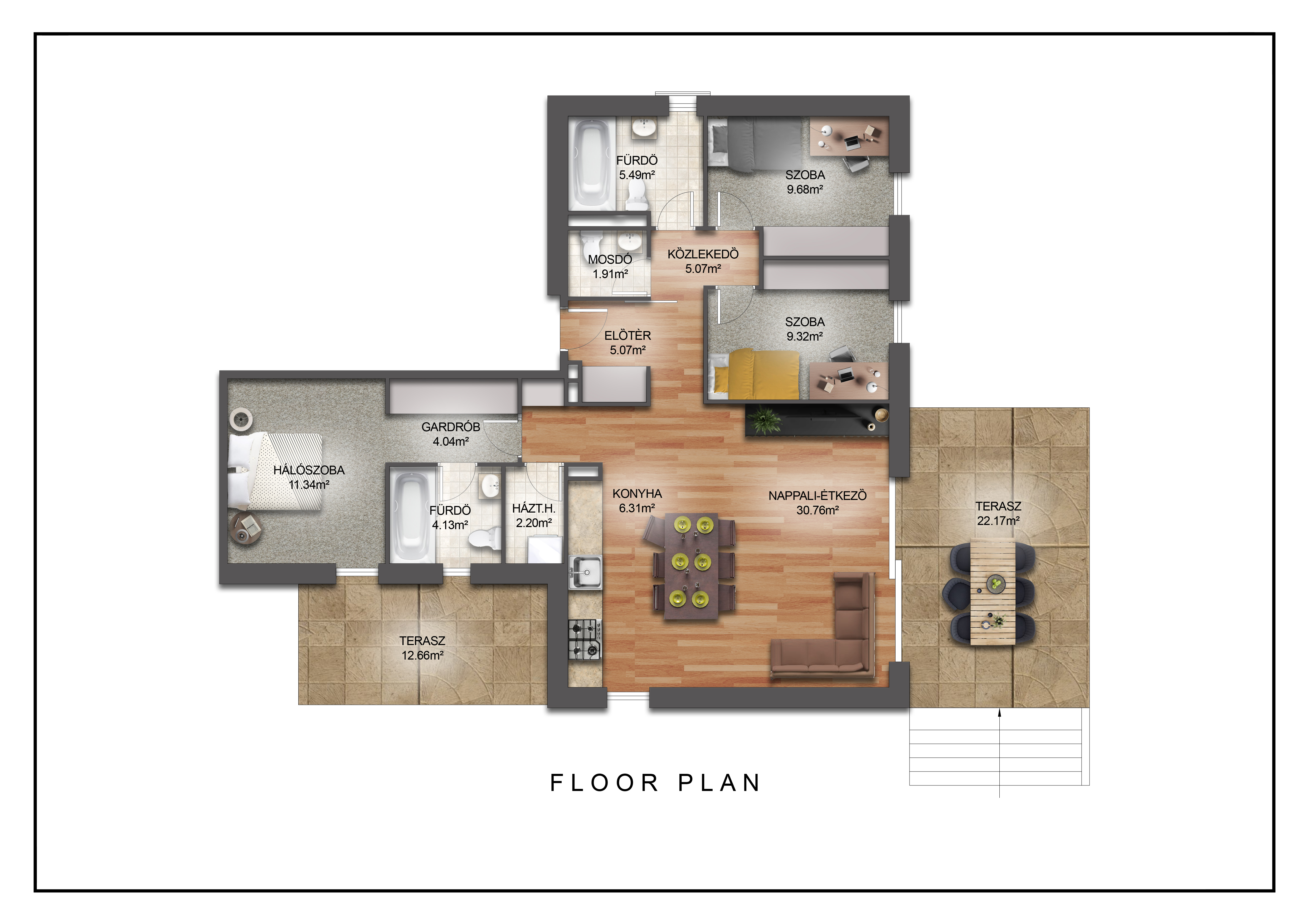 Előtér (4,89 m²), mosdó (1,91 m²), fürdő (5,49 m²), közlekedő (2,50 m²), szoba (9,68 m²), szoba (9,32 m²), nappali-étkező (30,42 m²), konyha (6,52 m²), háztartási helyiség (2,20 m²), gardrób (4,04 m²), fürdő (4,13 m²), szoba (11,34 m²), terasz (21,00 m²), terasz (12,66 m²). Ehhez a lakáshoz kizárólagos használatú kert is tartozik.
