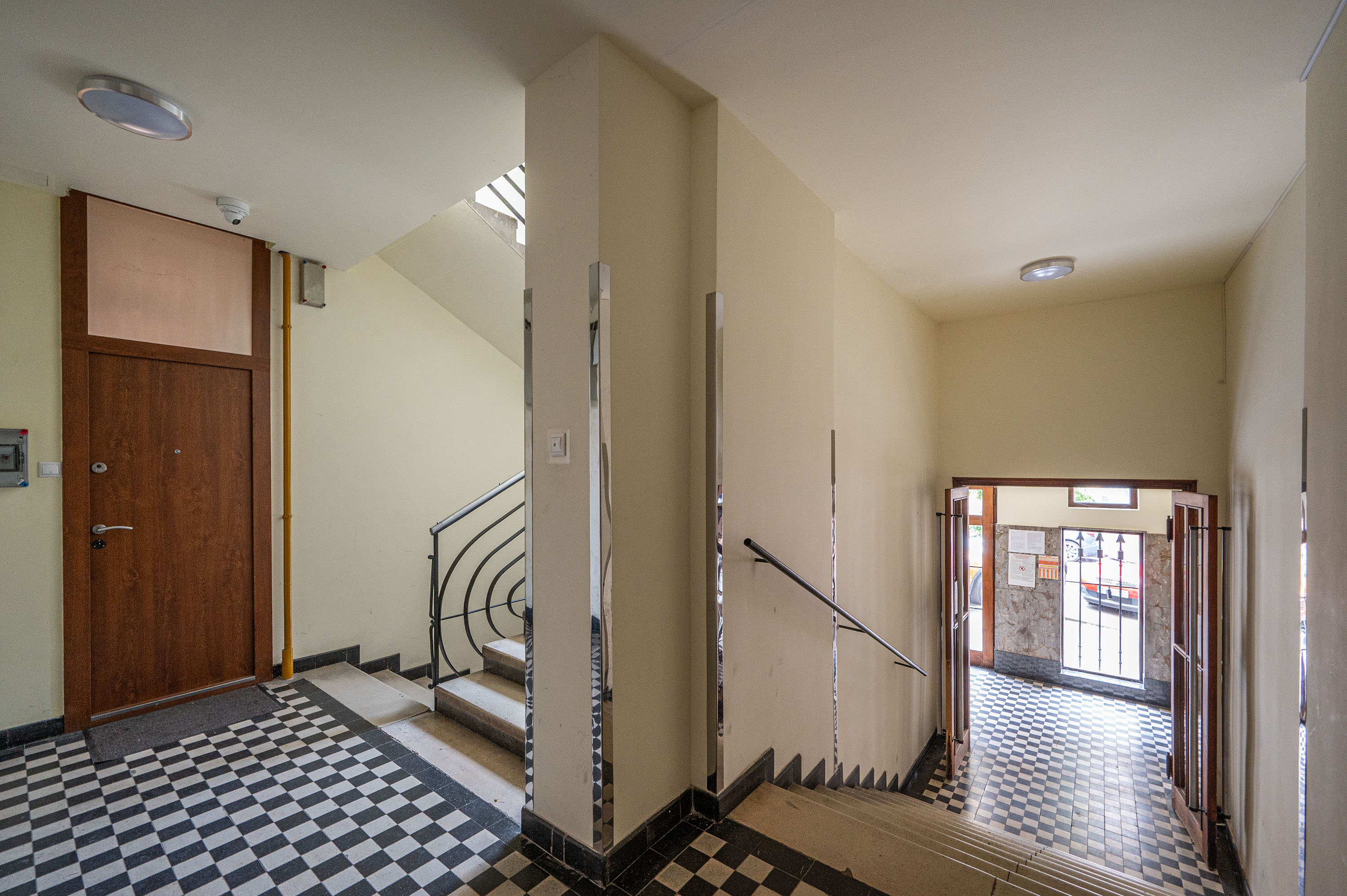 A lakás egy összesen 18 lakásos, rendezett anyagi viszonyokkal rendelkező Bauhaus stílusú társasházban található, ahol a lakóközösség kifejezetten együttműködő és csendes. Az épület téglából épült, modern stílusú, zárt lépcsőházzal rendelkezik, lift nincsen.