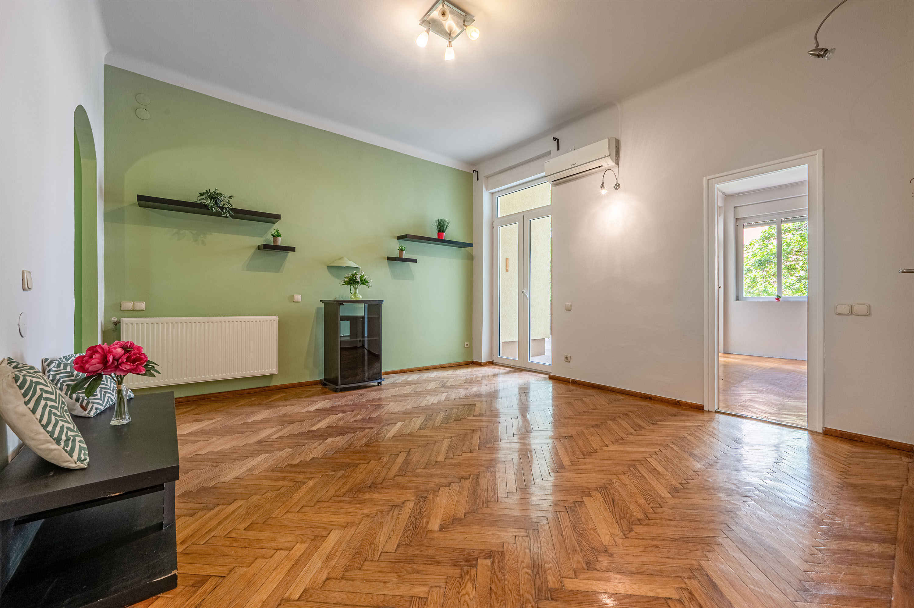 A New York kávéháztól kétsarokra található, a VII. kerület egyik legzöldebb, csendes kis utcájában elhelyezkedő, jó állapotban lévő, frissen festett, bútorozatlan (megegyezés alapján bebútorozható) modern lakás, amely egy nagyméretű nappaliból és hálószobából, valamint egy étkezővel rendelkező gépesített konyhából, továbbá egy tusolós fürdőszobából és egy vendégmosdóból áll. A lakáshoz tartozó hatalmas napfényes erkélyről a csendes utca zöldjét lehet megcsodálni. A minimális bérleti időtartam 12 hónap. Dohányzás nem engedélyezett a bérleményben, ugyanakkor a házikedvenceket örömmel fogadják a bérleményben. A lakás jelenleg bútorozatlan, a bútorozás megállapodás kérdése. A lakáshoz két, összesen 25 m2 tároló is tartozik.