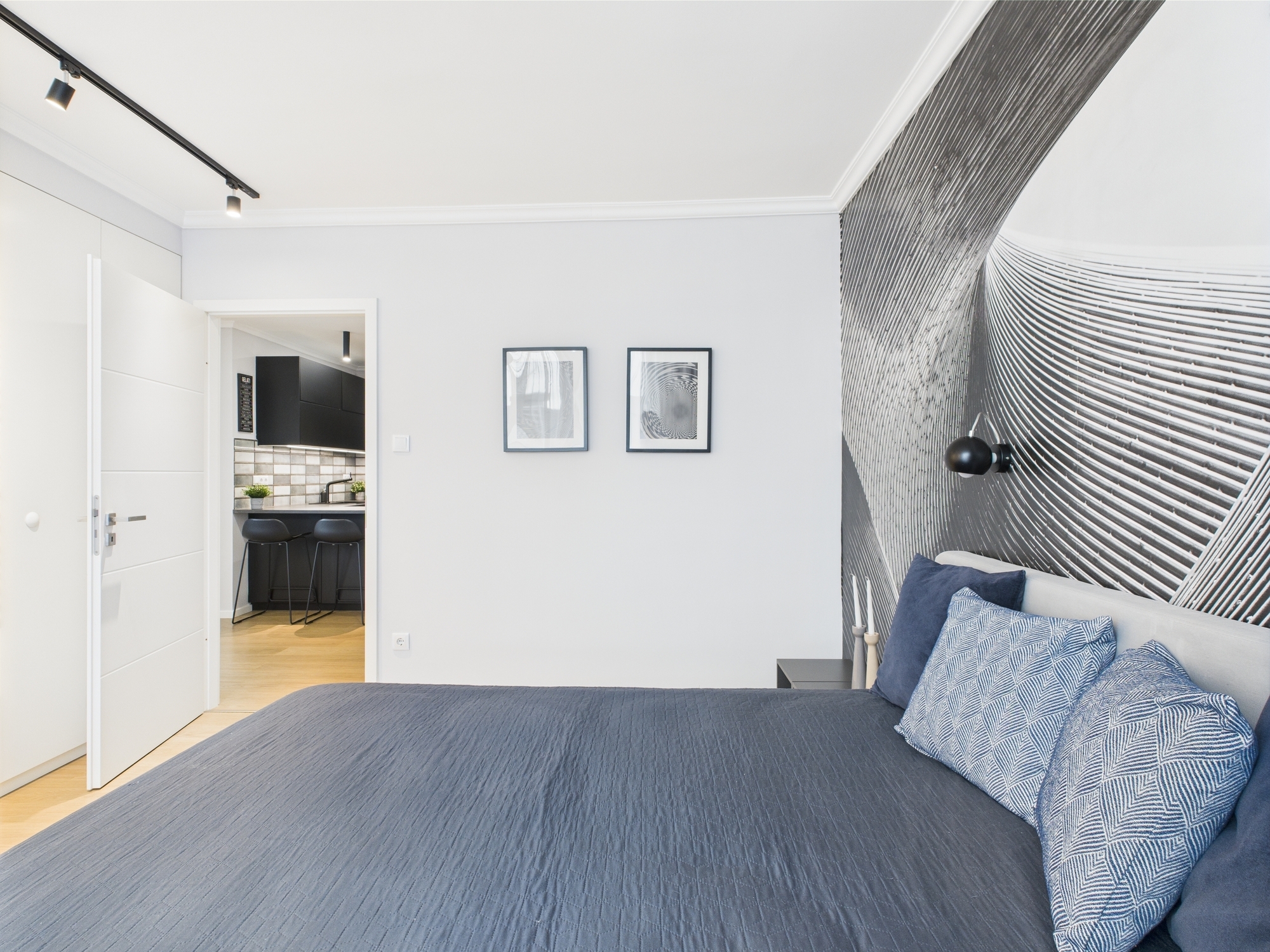 • a hálószobában lendületes fotógrafikus poszter teszi izgalmassá a puritán bútordizájnt , 60 cm mély gardrób is található