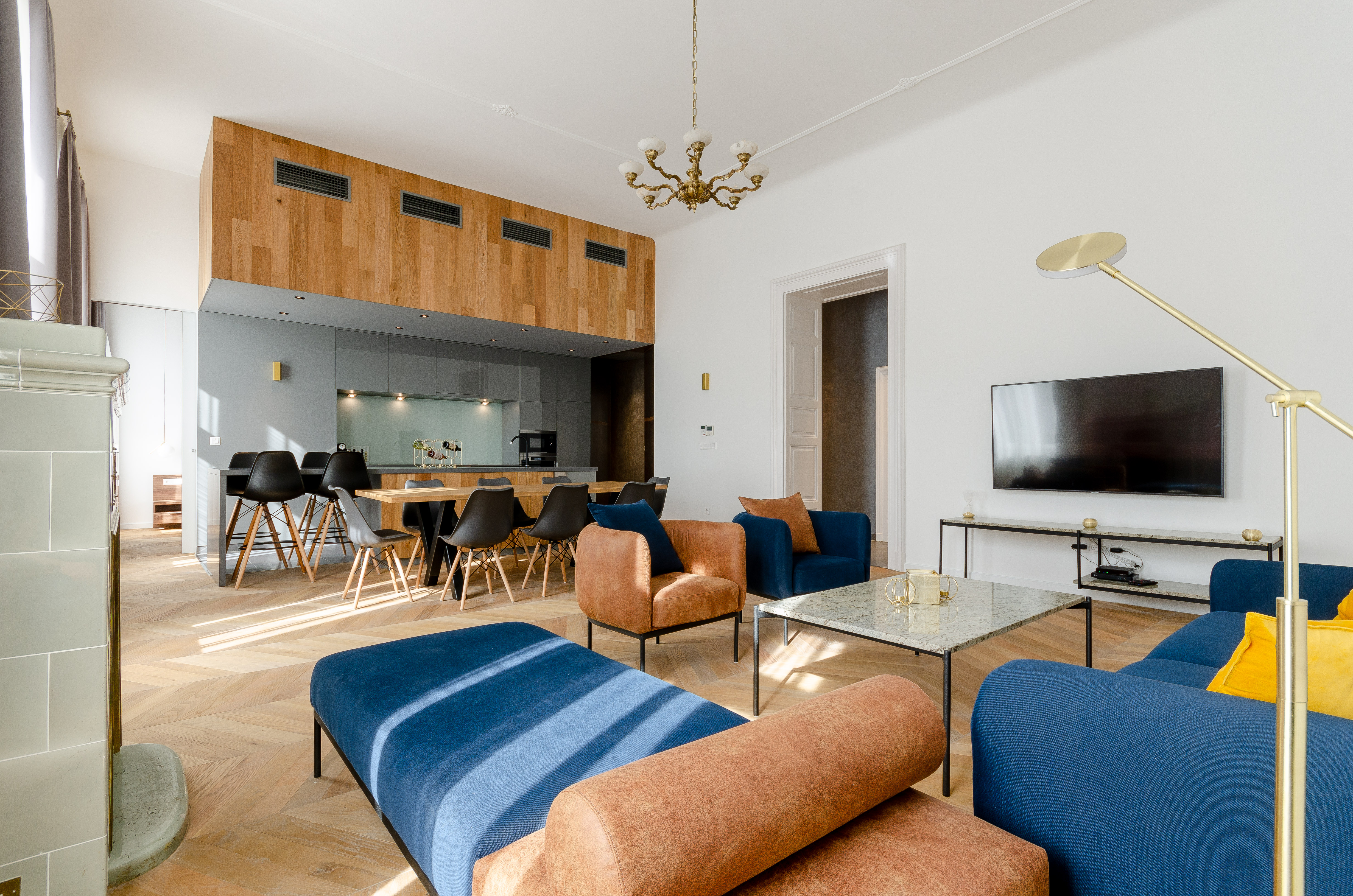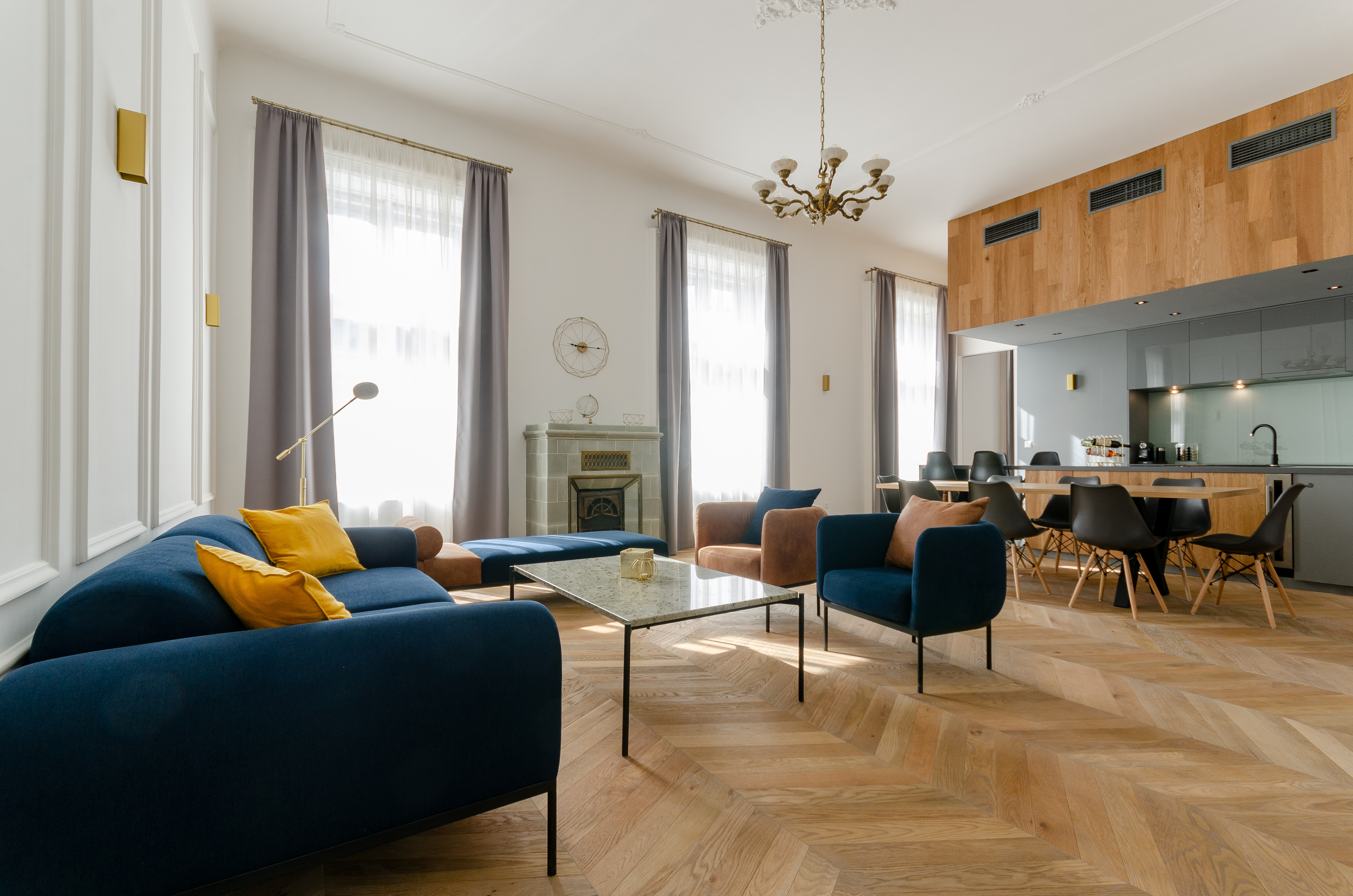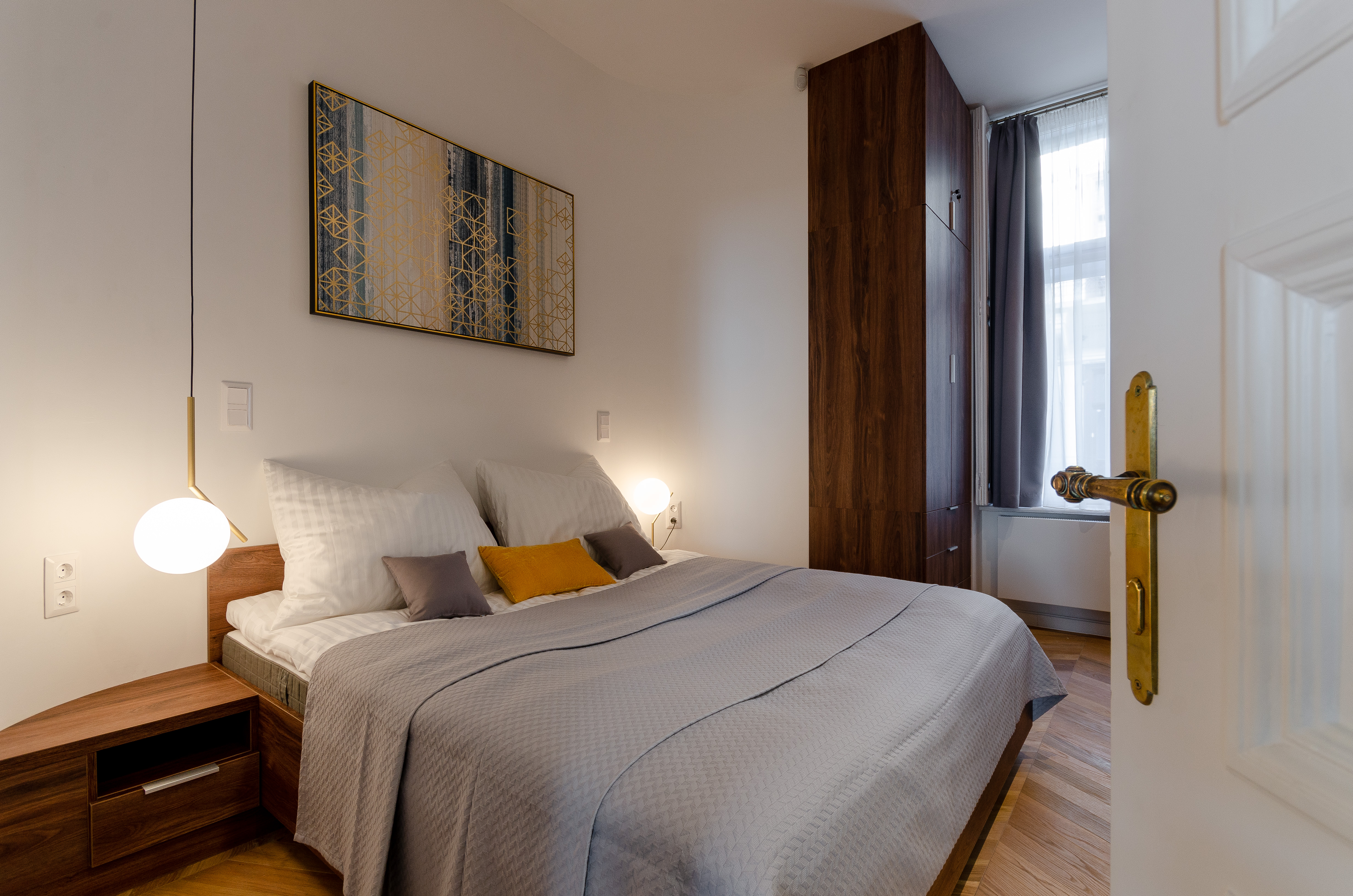 A frissen felújított lakás a gyönyörűen karbantartott, 1882-ben épült Fonciére-palota történelmi épületének harmadik emeletén helyezkedik el. A négyméteres belmagasságnak és az Andrássy úti tájolásnak köszönhetően a lakás természetes fényárban fürdik. A teljesen bútorozott lakás minden helyisége számos tárolóval, praktikusan kialakított beépített bútorzattal rendelkezik.