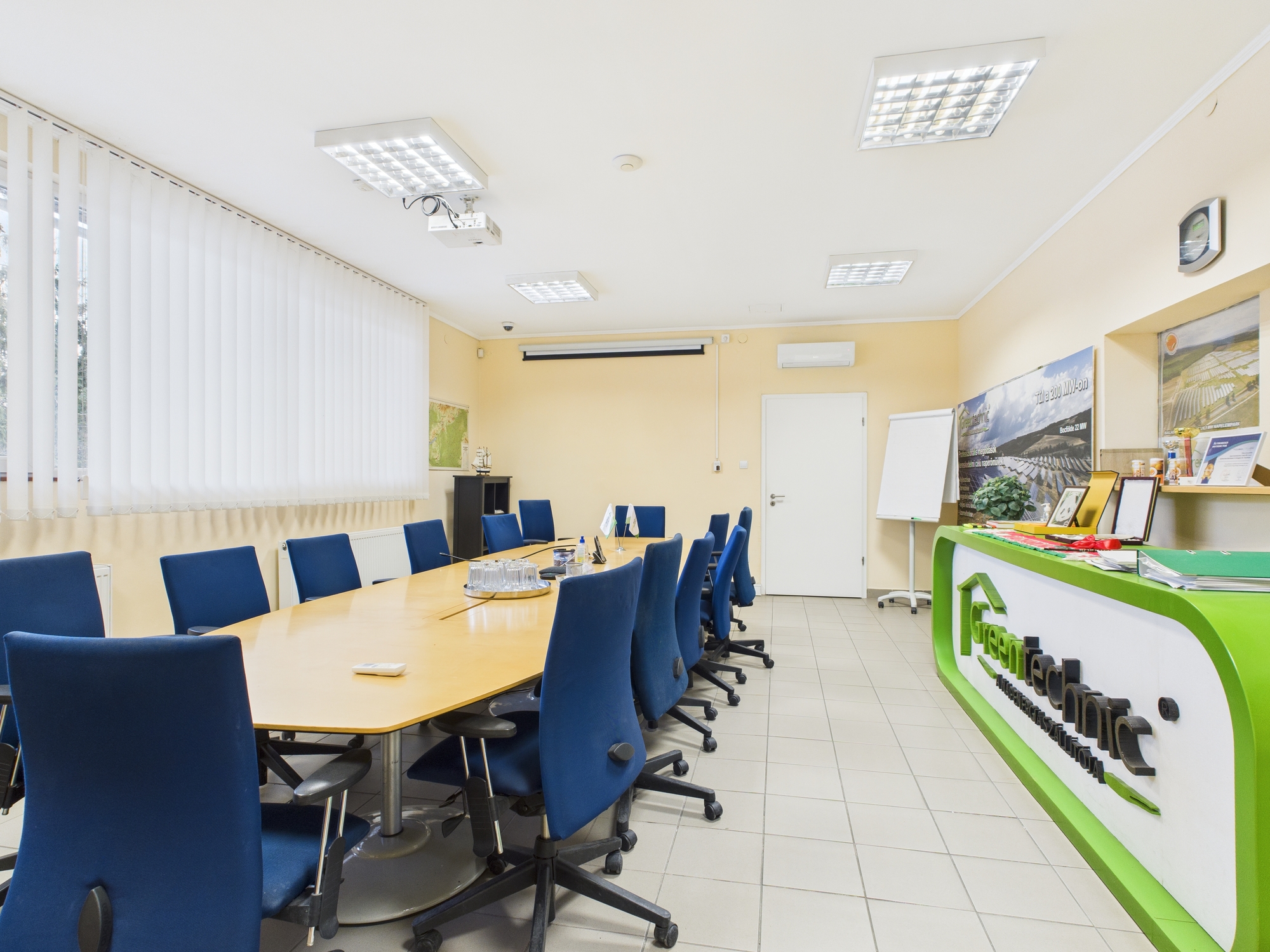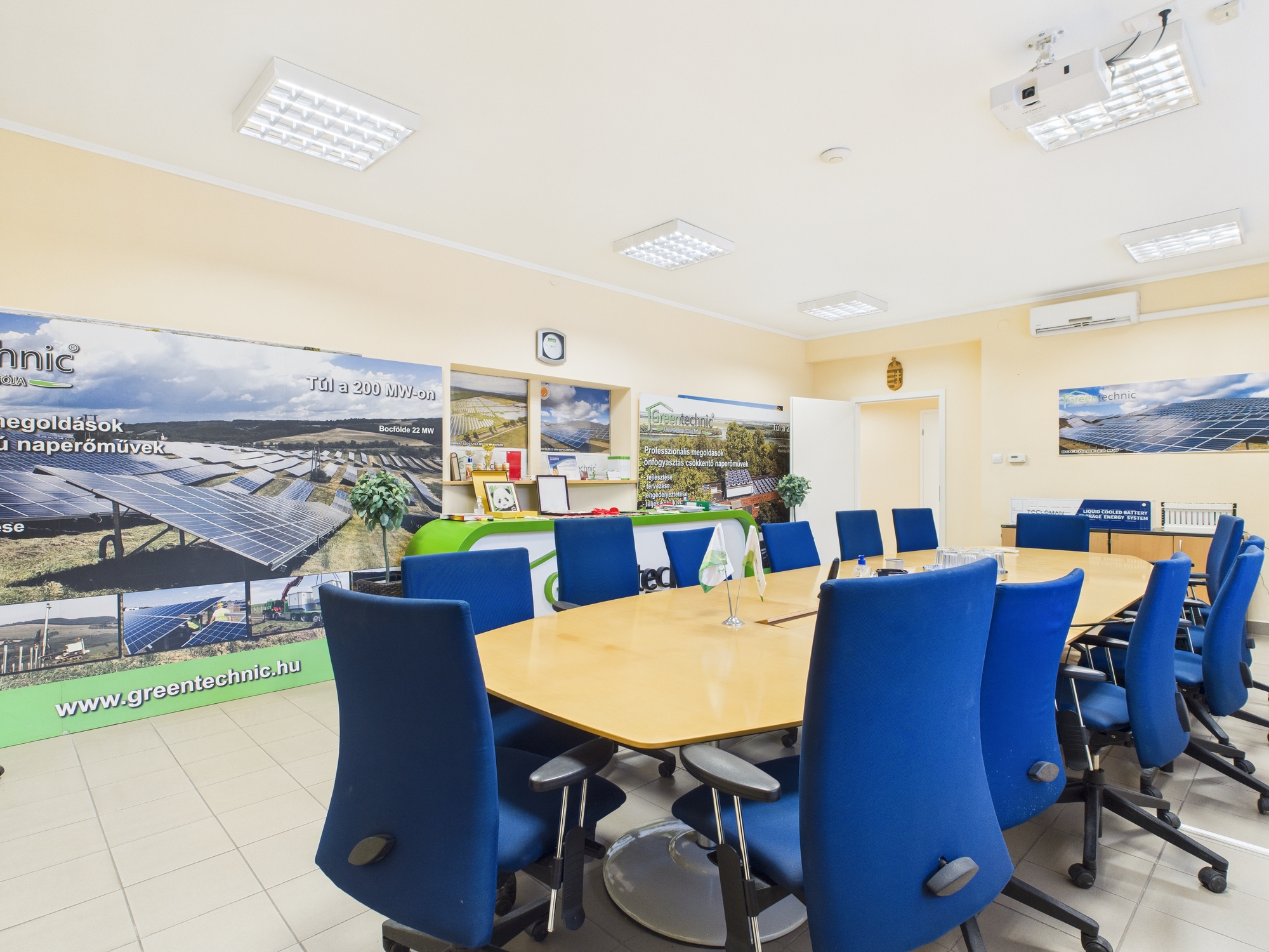 Fűtés, melegvíz: Kombi pelletgáz kazán ~40 kW, melegvíztárolós vízmelegítő, termodinamikus hőszivattyú, légkondicionáló (minden iroda) és napelem (30 kW-os, 20 kW-os inverterrel)