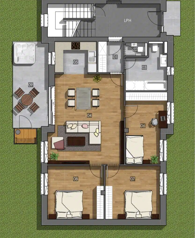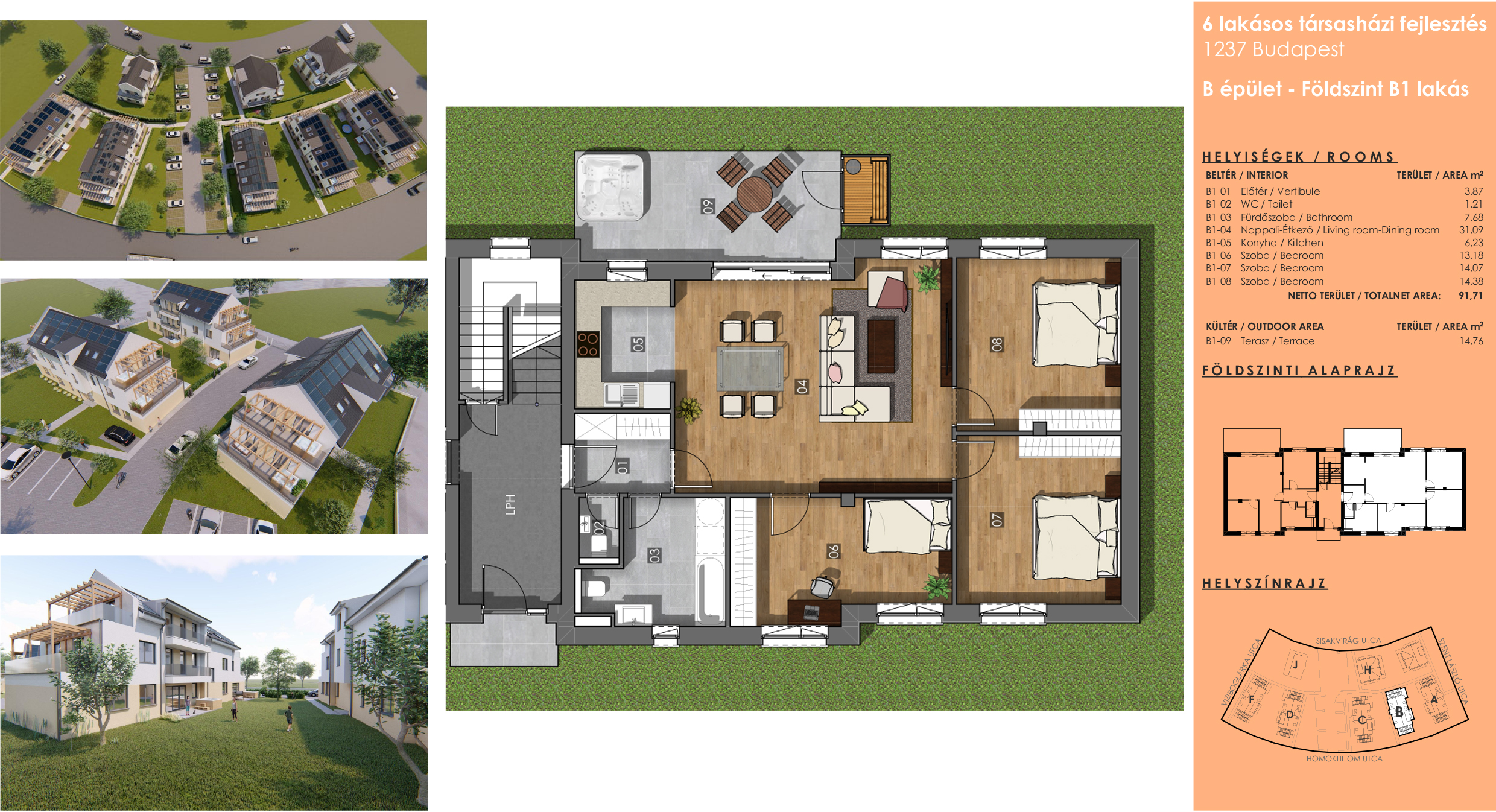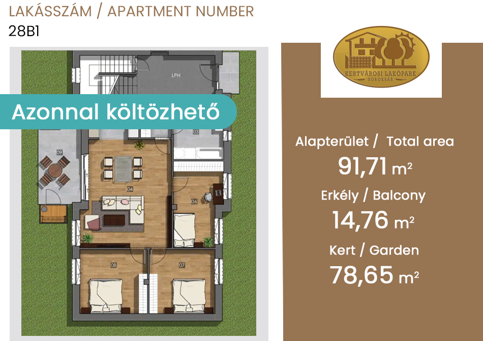 A földszinti lakást a hatalmas közös terek jellemzik, amelyek ideálisak egy gyermekes család részére. A földszinti lakáshoz kapcsolódó saját terasz (14,76 m2) és kertrész (78,65 m2) biztosítja gyermekeid részére a szükséges mozgás- és játékteret, pancsolási lehetőséget, illetve a szülők részére a barátokkal történő kikapcsolódási lehetőséget. A lakáshoz szauna és jacuzzi beépítési lehetőséget biztosított a beruházó, hogy a lakók nyugodtan lazíthassanak egy fáradt nap után.